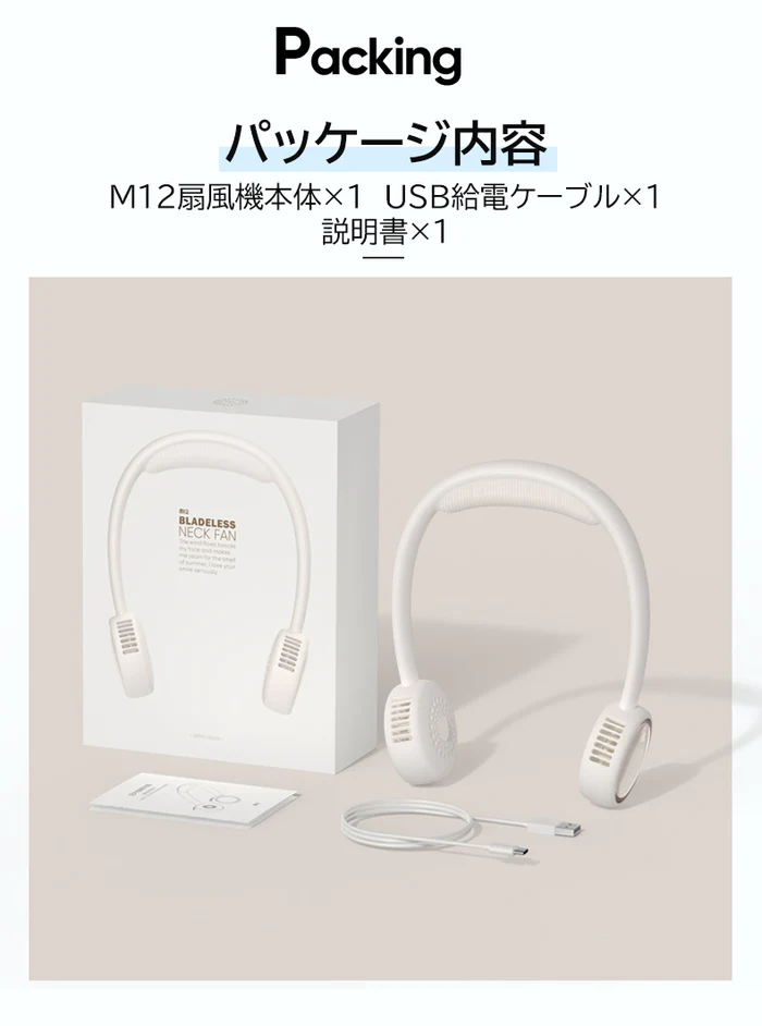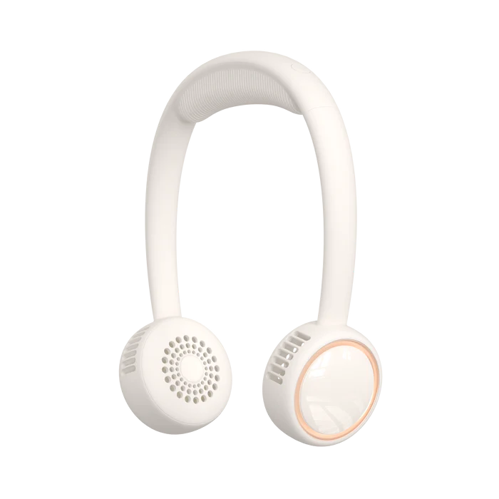 M12の首掛け扇風機は、ホワイトカラーで、携帯扇風機として便利に使用できます。